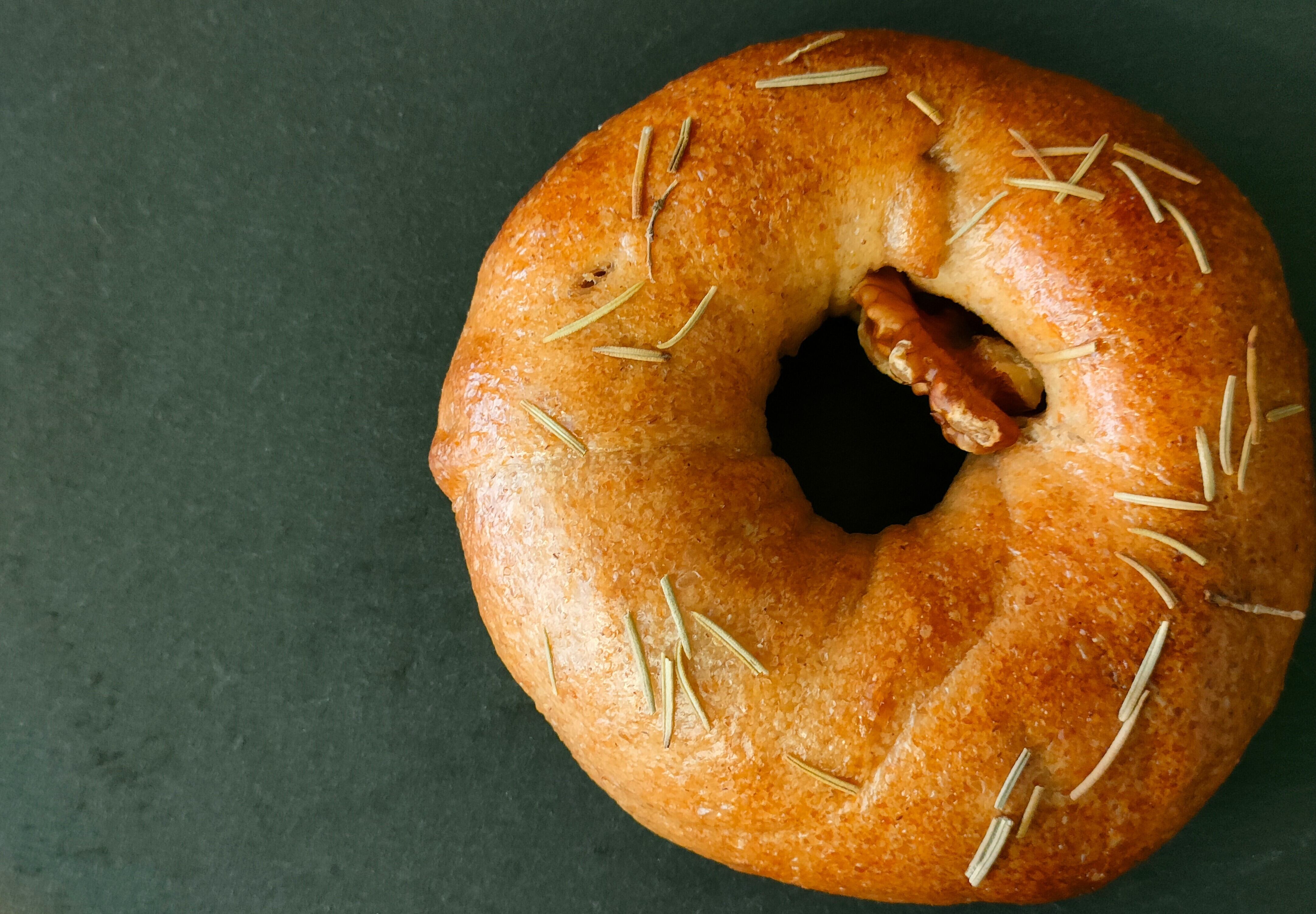 香り高いローズマリーとオリーブ、そしてドライトマトの風味が楽しめるベーグルです。ブラックオリーブとグリーンオリーブがアクセントになり、ローストしたくるみとドライトマトの風味と相まって、まさにオススメです。アクセントにローストしたクルミも巻き込みました。